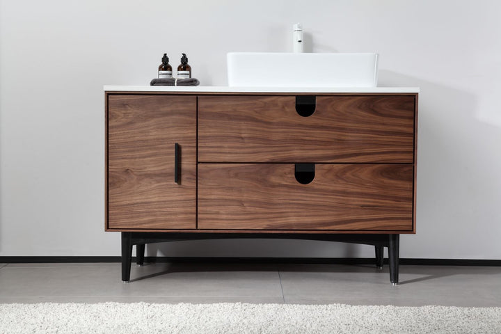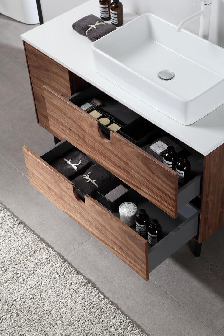 Ce petit meuble de rangement aux façades de bois de chêne massif est idéal pour apporter une note chic au naturel à votre salle de bain. Équipé de deux tiroirs et d’un comptoir en quartz blanc, ce meuble vous offrira un nouvel espace de rangement design.