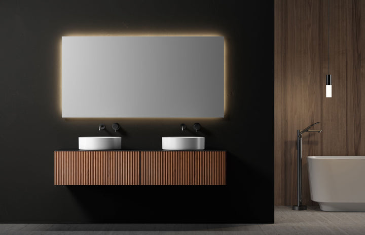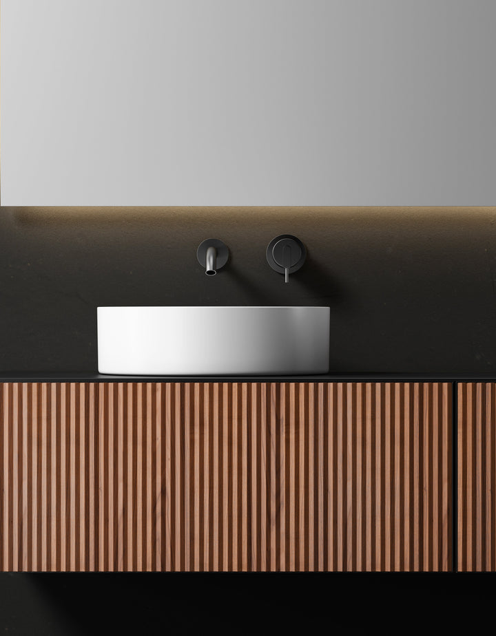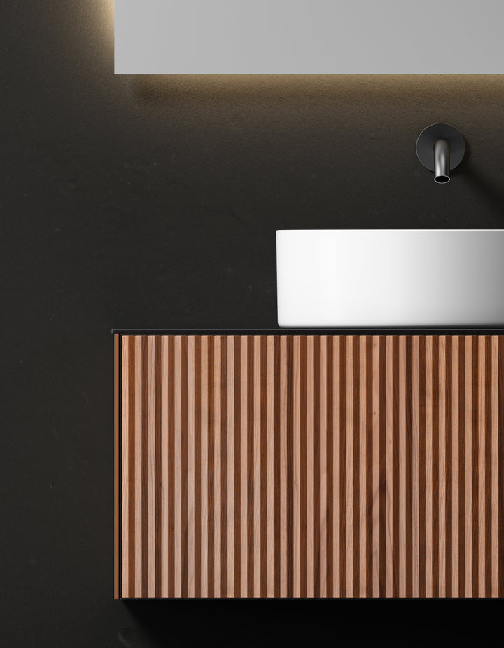 Avec la vanité suspendue INGRID apporté un style moderne à une salle de bain ou une salle d'eau avec son esthétique organique et ses les lignes épurées de bois ondulé naturel.