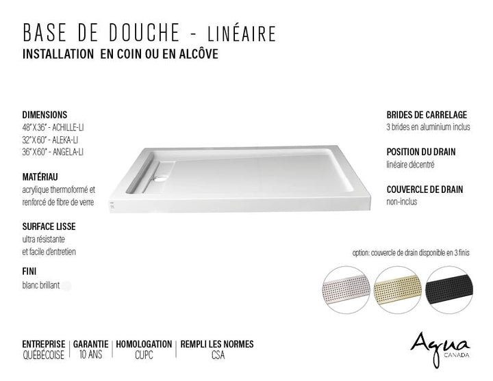 Base de douche lisse 32"x 60"pour installation en alcôve ou en coin