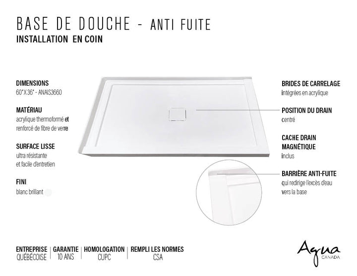 Base de douche lisse 36"x 60"installation en coin (droite)