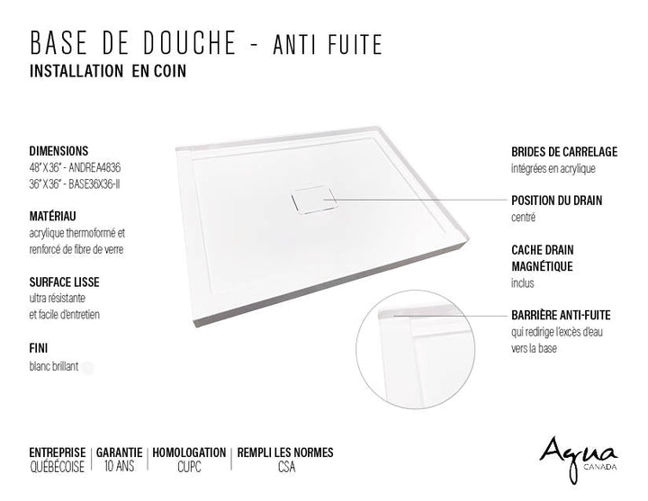 Cette base de douche rectangulaire blanche est conçue pour une installation en coin. Mesurant 36"x 48", ANDREA3648-R est fabriqué en acrylique renforcé de fibre de verre et comprend deux brides en acrylique intégrées pour simplifier l’installation. Grâce aux barrières de fuite incluses dans la bride acrylique moulée directement sur la base, aucune fuite n’est possible. La barrière de fuite redirige l’excès d’eau directement dans la base. Complétez votre nouvelle douche en ajoutant des portes vitrées que vous trouverez parmi notre sélection !