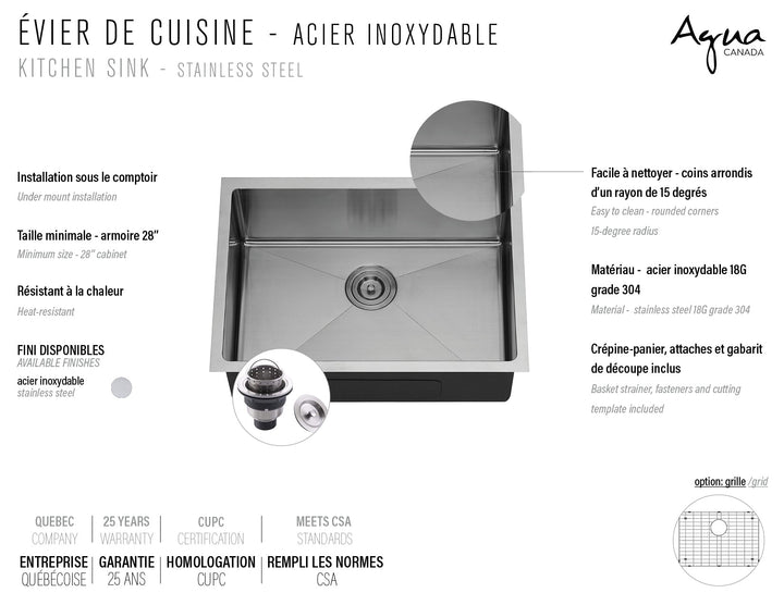 Évier de cuisine sous plan, 1 cuve, 25''X18''