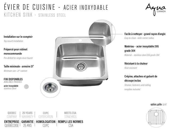 Évier de cuisine sur plan, 1 cuve, 20''X20.5''
