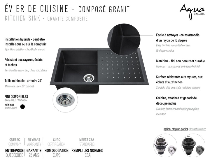 L'ESSENCE est un évier de cuisine composite en granit noir de qualité supérieure conçu pour durer, design élégant avec une fonctionnalité robuste. Ce modèle est une installation encastrable avec un égouttoir attaché. Des lignes épurées combinées à un évier spacieux et à un égouttoir intégré apportent un nouveau look à votre cuisine.