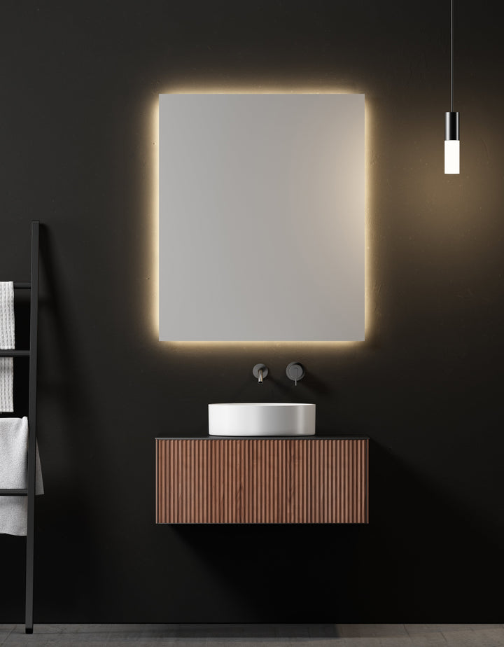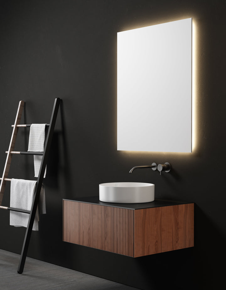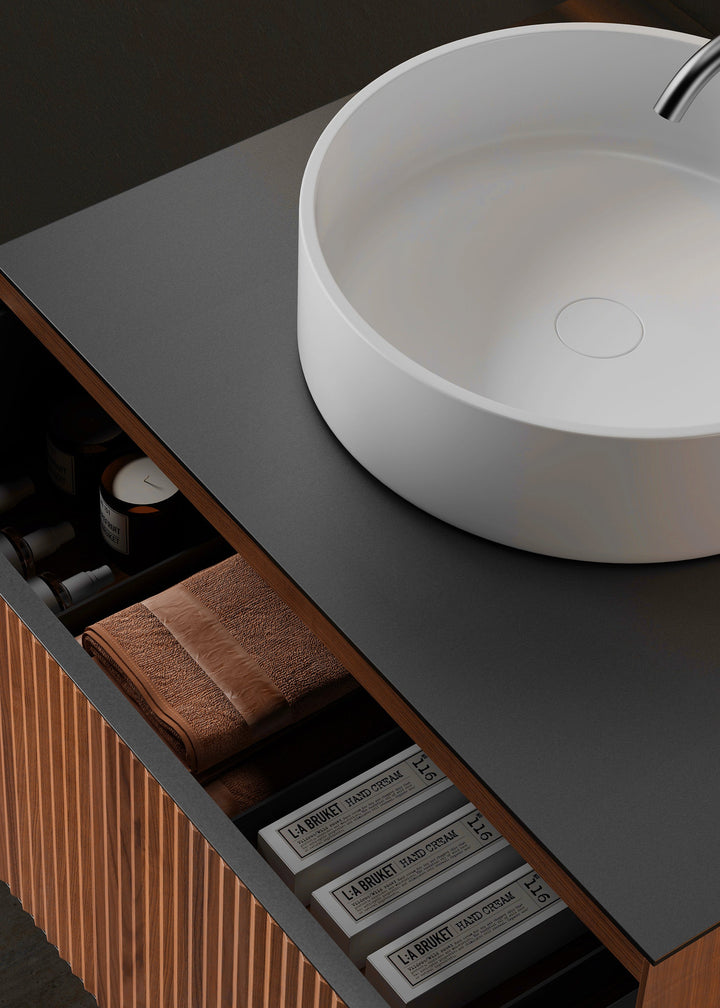 Avec la vanité suspendue INGRID apporté un style moderne à une salle de bain ou une salle d'eau avec son esthétique organique et ses les lignes épurées de bois ondulé naturel.