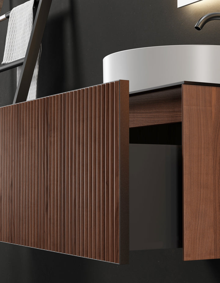 - Meuble lavabo 1 tiroir. Façade de tiroir en placage de bois ondulé naturel V008.