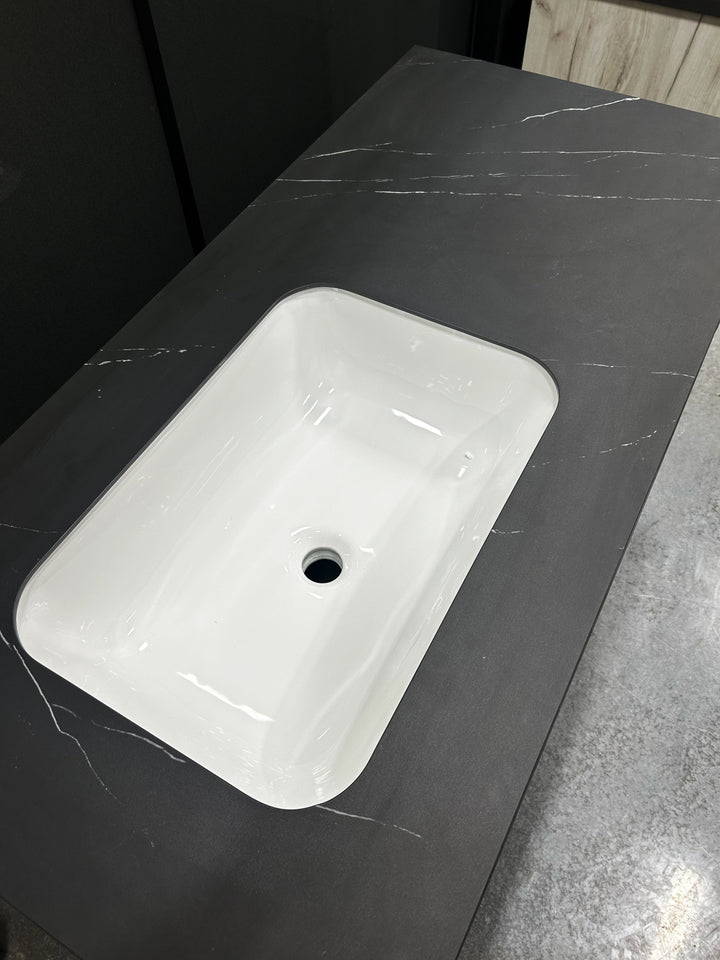 - Comptoir avec lavabo encastré en céramique blanc lustré.