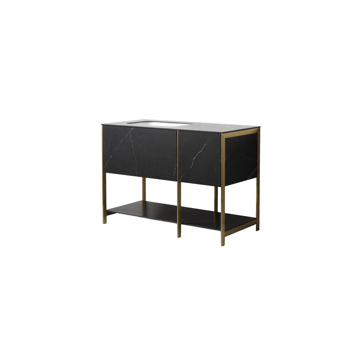 Très raffiné, la vanité ISIS est mise en valeur par ses tuiles de porcelaine effet marbre noir de ses deux tiroirs et son comptoir. De plus sa structure de métal fini or apporte un peu de glamour à votre salle de bain. Dotée de beaucoup de rangements, vous pourrez facilement disposer de vos effets personnels.