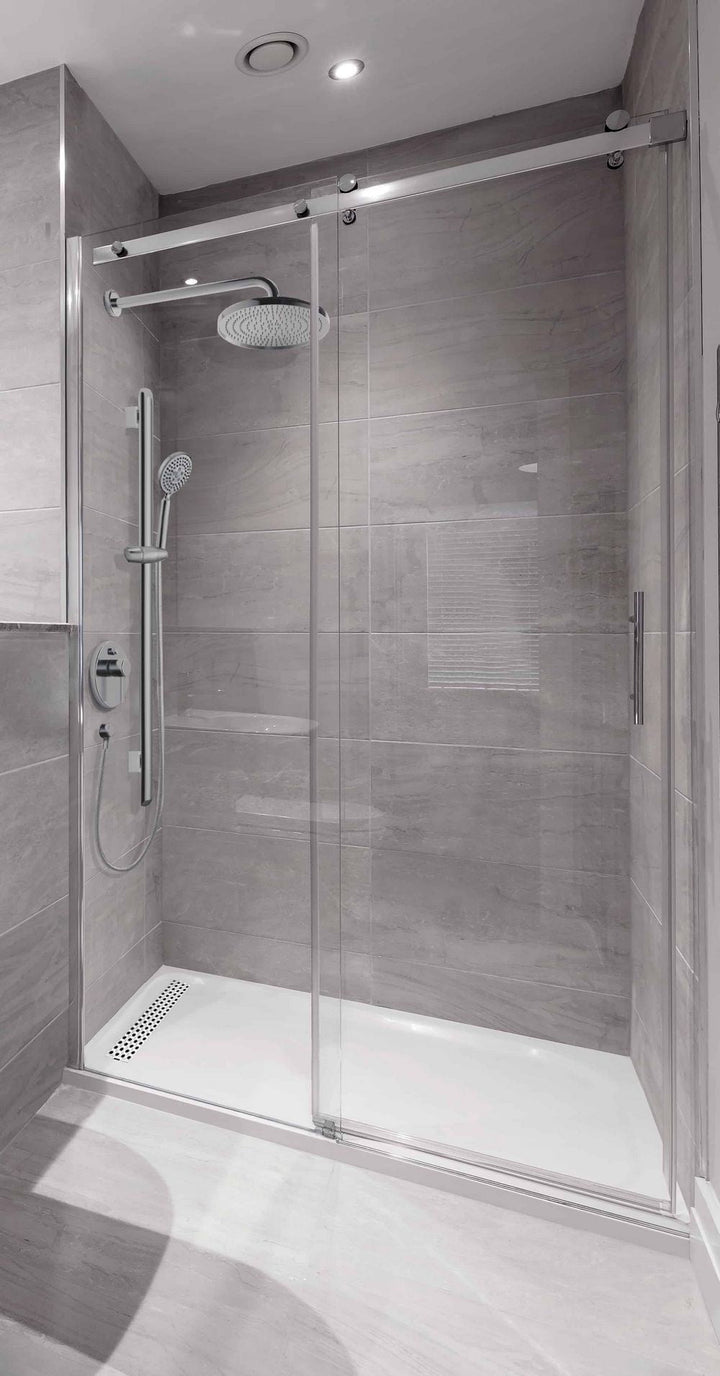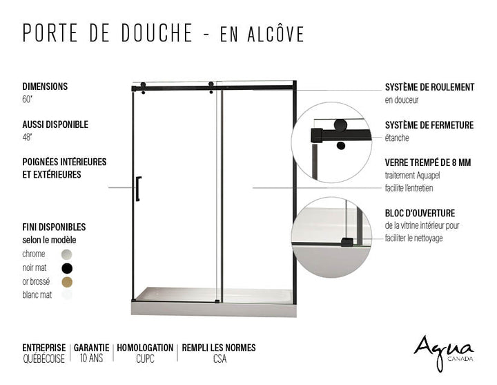 Complétez votre salle de bain en choisissant une douche de style contemporain. La porte coulissante est en verre trempé de 8 mm et traitée avec Aquapel pour assurer durabilité et facilité d'entretien. La porte a deux grandes poignées et une quincaillerie en acier inoxydable de haute qualité. Pour une douche en coin, la porte peut être accompagnée d'un panneau de retour de 32'' ou 36''.