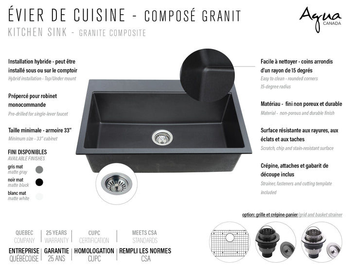 Amateurs de granit élégant, voici un évier de haute qualité composé à 80 % de granit naturel, l'évier de cuisine noir mat ERICA présente une surface résistante aux rayures, aux éclats, aux taches et non absorbante. CommeUn entraîneur, des attaches et un gabarit de découpe sont inclus.