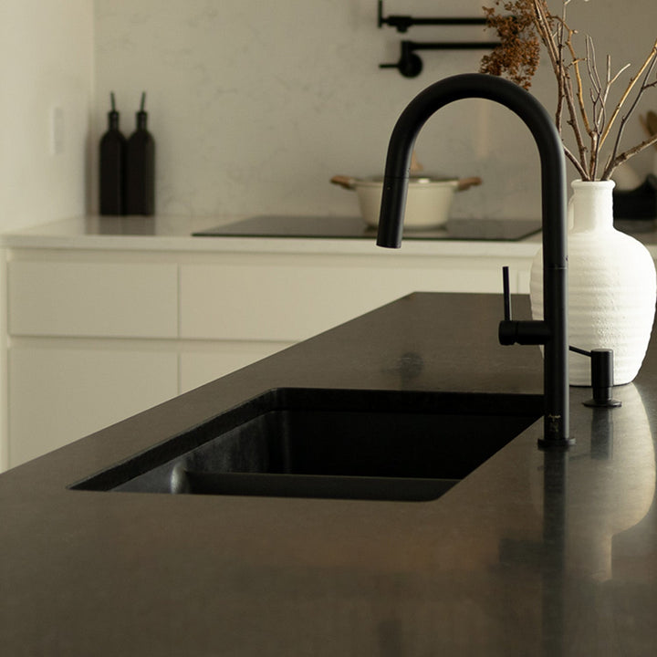 Our stylish granite lovers, here is a high quality sink made of 80% natural granite, the EMIR-S matte black kitchen sink features a scratch-resistant, chip-resistant, stain-resistant and non-absorbent surface. A strainer, fasteners and a cutting template is included.