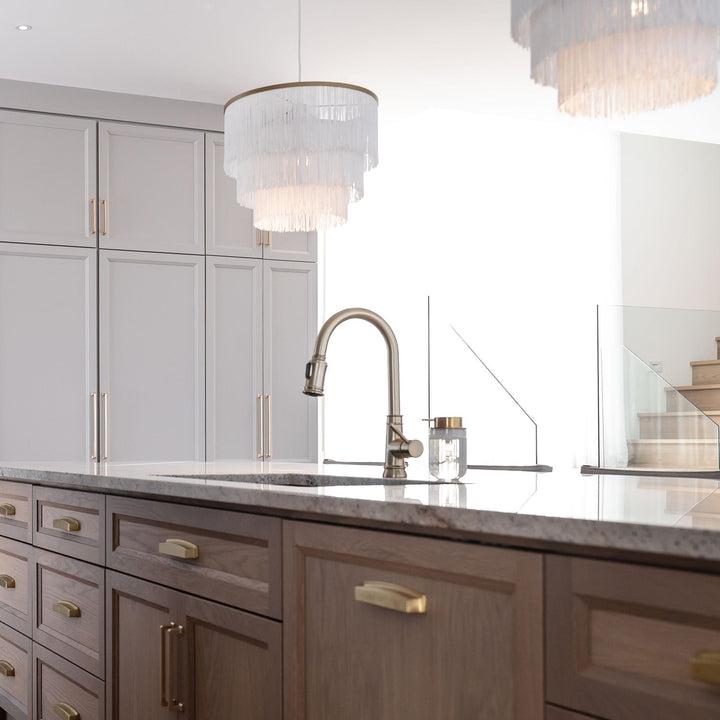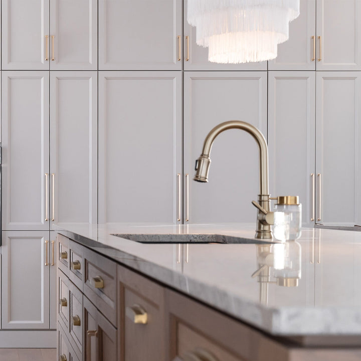 Bring a classic touch to your kitchen thanks to MONACO-GD timeless kitchen faucet. This solid brass made faucet includes a 2-jet pull-down spray and a flared spout, combining convenience and style. With its brushed brass (gold) quality finish, you can match it to any kitchen to emphasize its look.